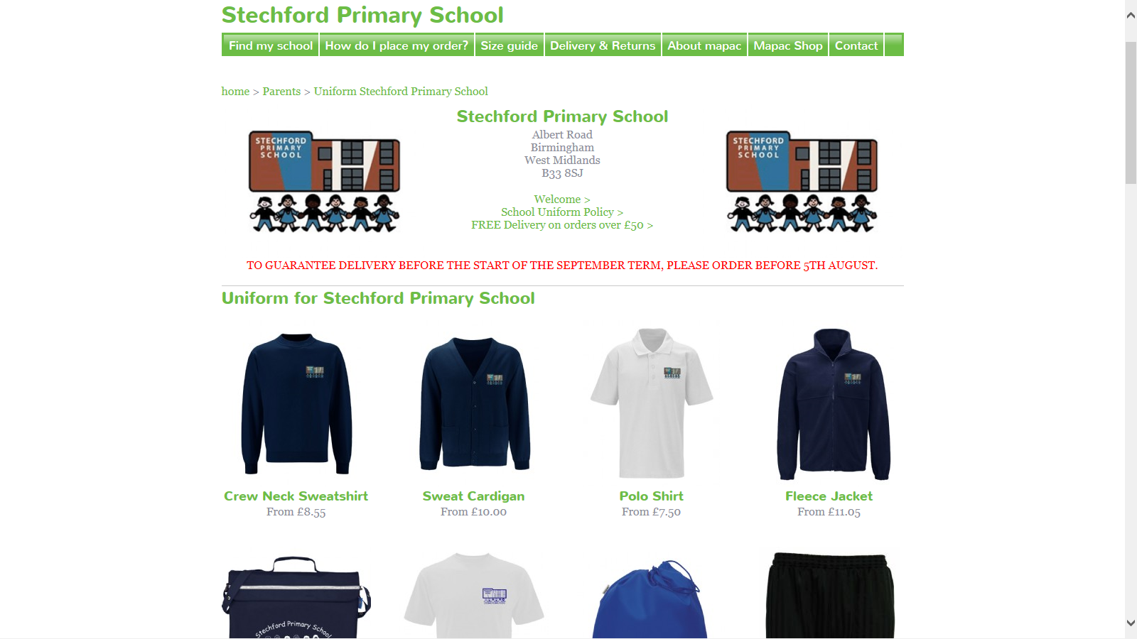 Stechford Primary school is  a cashless school. Any items of school uniform with the school logo need to be ordered online through MAPAC using the link below. Ordering is easy and you can have the uniform sent to your home adress or collect from school.